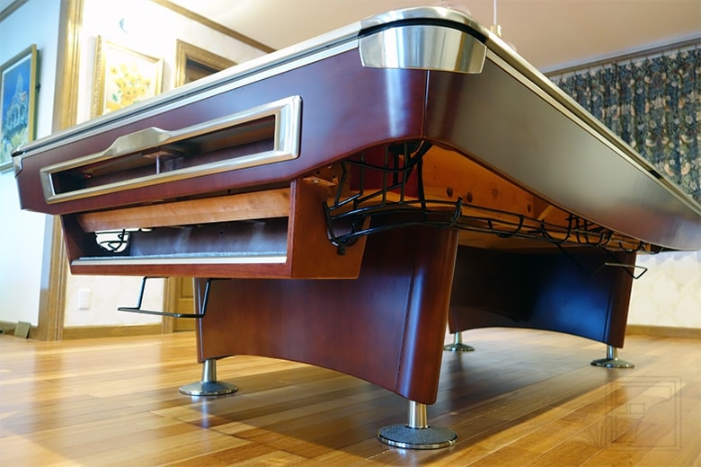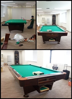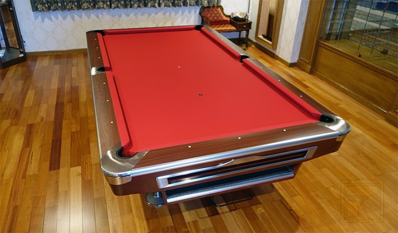 9フィートビリヤードテーブルYAL5は290cm×160cmの大きさがありますので、キューの長さ(150cmで計算)を足すと590cm×460cm。この数字以上の広さがあればキューが壁に当たらないように設置することができます。